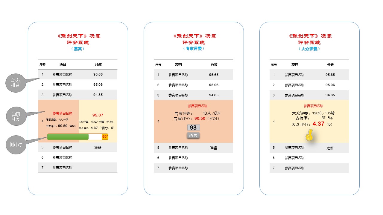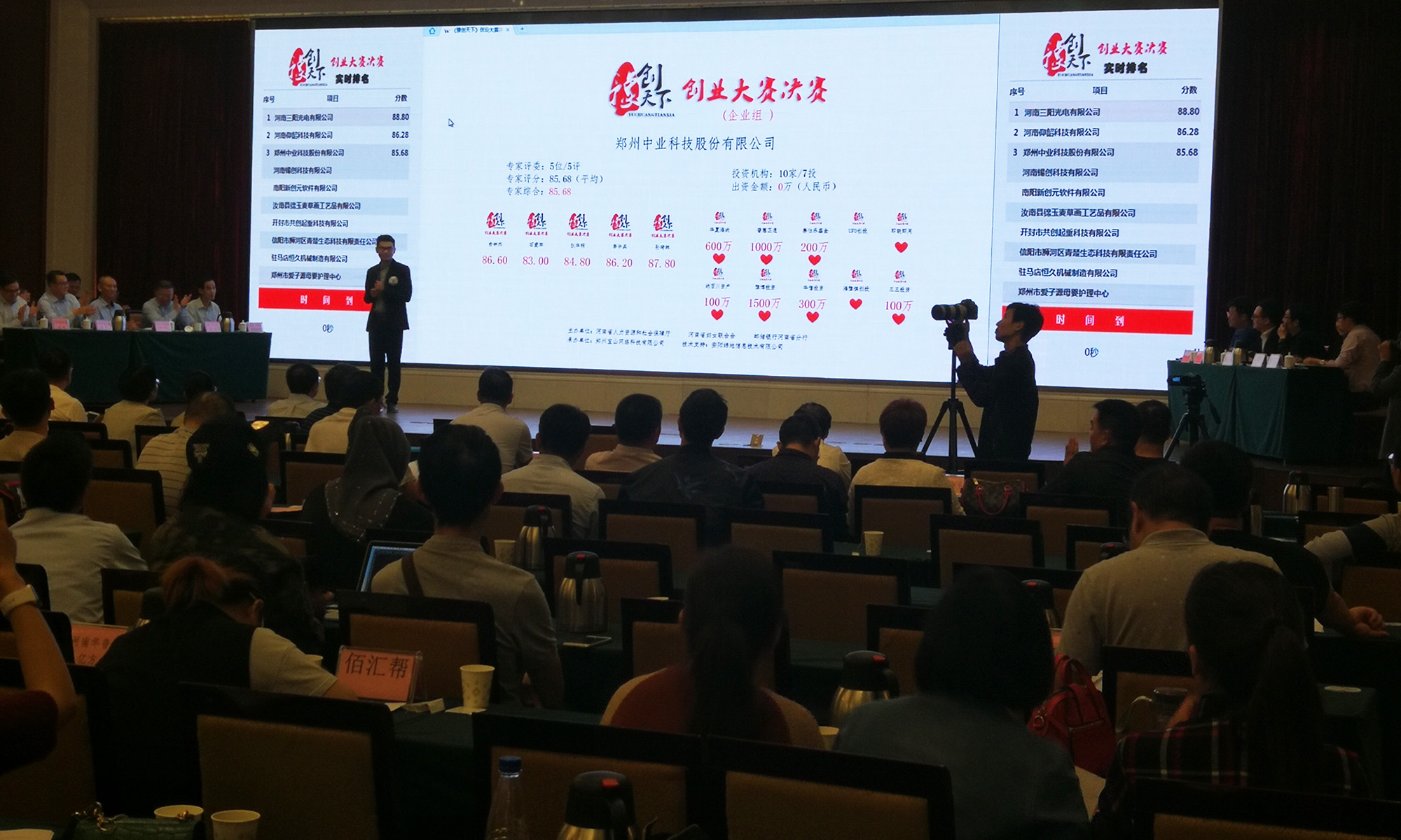 河南省《豫创天下》创业大赛的实时评分系统,用的是【纬地云】的“评分系统”系统,实现了:当场打分,当场出结果,动态排名,透明显示,“大众评委”支持支持率动态变化,点赞人数实时攀升,投资人心动意向表示,投资额当场输入,实时显示,融资意向选择当场锁定,以上内容全部在整合同一界面展示,效率高,公开、公正、透明,不给“人为插手”任何机会,彻底消除疑问和顾虑,做到比赛无争议;大众参与度高,整场跌宕起伏,扣人心弦,环节紧凑,有序可控,确保比赛在网络科技的氛围中完美收官。
